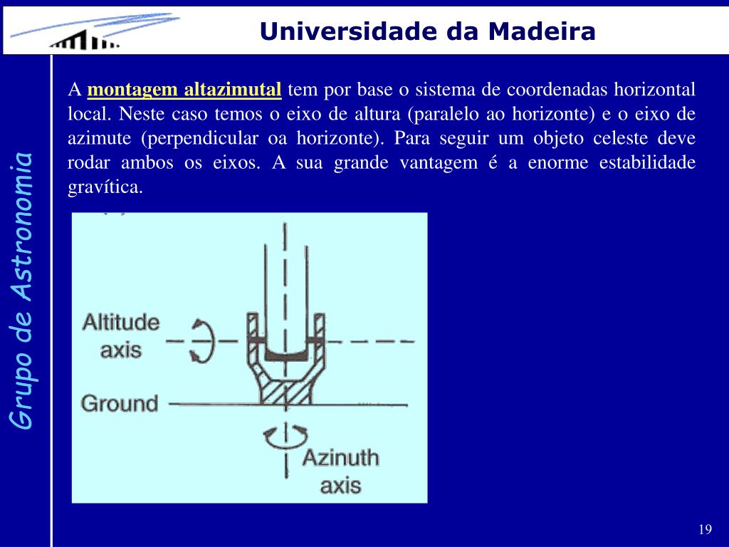 Universidade da Madeira A montagem altazimutal tem por base o sistema de coordenadas horizontal local. Neste caso temos o eixo de altura (paralelo ao horizonte) e o eixo de azimute (perpendicular oa horizonte). Para seguir um objeto celeste deve rodar ambos os eixos. A sua grande vantagem é a enorme estabilidade gravítica. Grupo de Astronomia 19