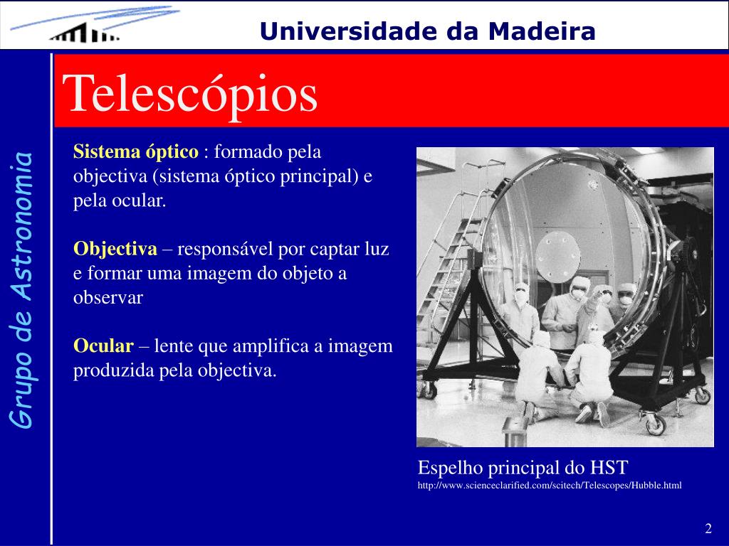 Universidade da Madeira Telescópios Sistema óptico : formado pela objectiva (sistema óptico principal) e pela ocular. Objectiva – responsável por captar luz e formar uma imagem do objeto a observar Ocular – lente que amplifica a imagem produzida pela objectiva. Grupo de Astronomia Espelho principal do HST http://www.scienceclarified.com/scitech/Telescopes/Hubble.html 2