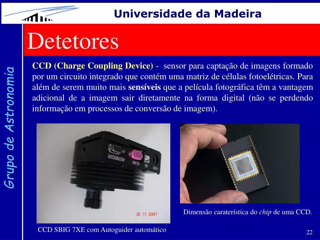 Universidade da Madeira Detetores CCD (Charge Coupling Device) - sensor para captação de imagens formado por um circuito integrado que contém uma matriz de células fotoelétricas. Para além de serem muito mais sensíveis que a película fotográfica têm a vantagem adicional de a imagem sair diretamente na forma digital (não se perdendo informação em processos de conversão de imagem). Grupo de Astronomia Dimensão caraterística do chip de uma CCD. CCD SBIG 7XE com Autoguider automático 22