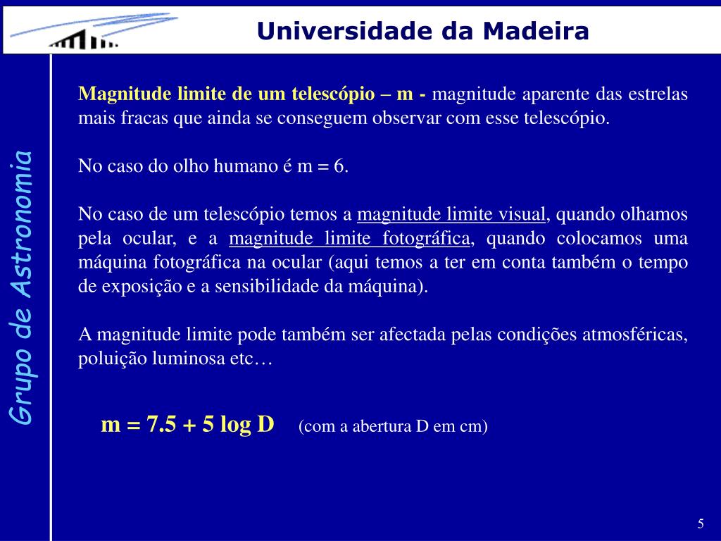 Universidade da Madeira Magnitude limite de um telescópio– m - magnitude aparente das estrelas mais fracas que ainda se conseguem observar com esse telescópio. No caso do olho humano é m = 6. No caso de um telescópio temos a magnitude limite visual, quando olhamos pela ocular, e a magnitude limite fotográfica, quando colocamos uma máquina fotográfica na ocular (aqui temos a ter em conta também o tempo de exposição e a sensibilidade da máquina). A magnitude limite pode também ser afectada pelas condições atmosféricas, poluição luminosa etc… Grupo de Astronomia m = 7.5 + 5 log D (com a abertura D em cm) 5