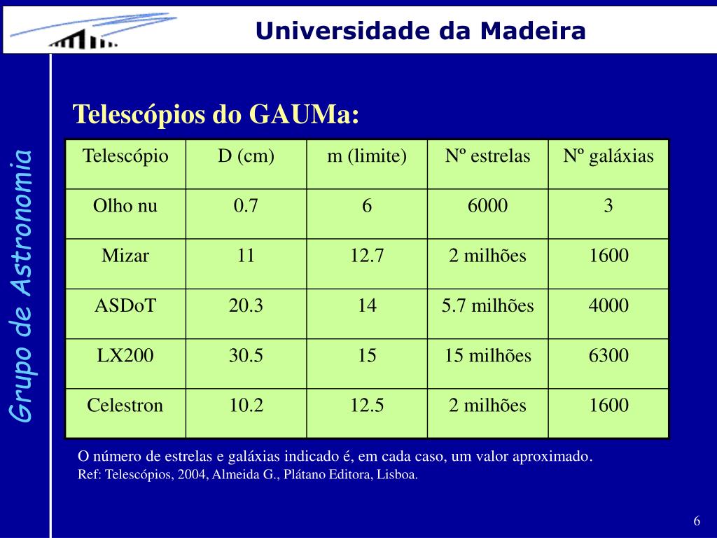 Universidade da Madeira Telescópios do GAUMa: Grupo de Astronomia O número de estrelas e galáxias indicado é, em cada caso, um valor aproximado. Ref: Telescópios, 2004, Almeida G., Plátano Editora, Lisboa. 6