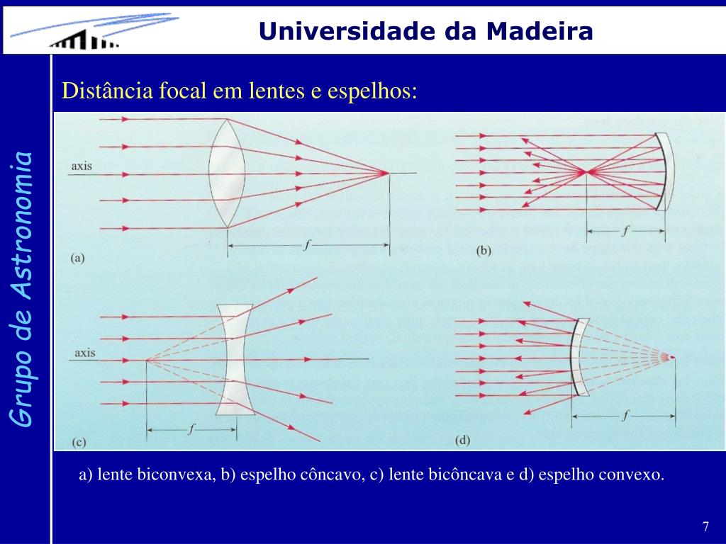 Universidade da Madeira Distância focal em lentes e espelhos: Grupo de Astronomia a) lente biconvexa, b) espelho côncavo, c) lente bicôncava e d) espelho convexo. 7