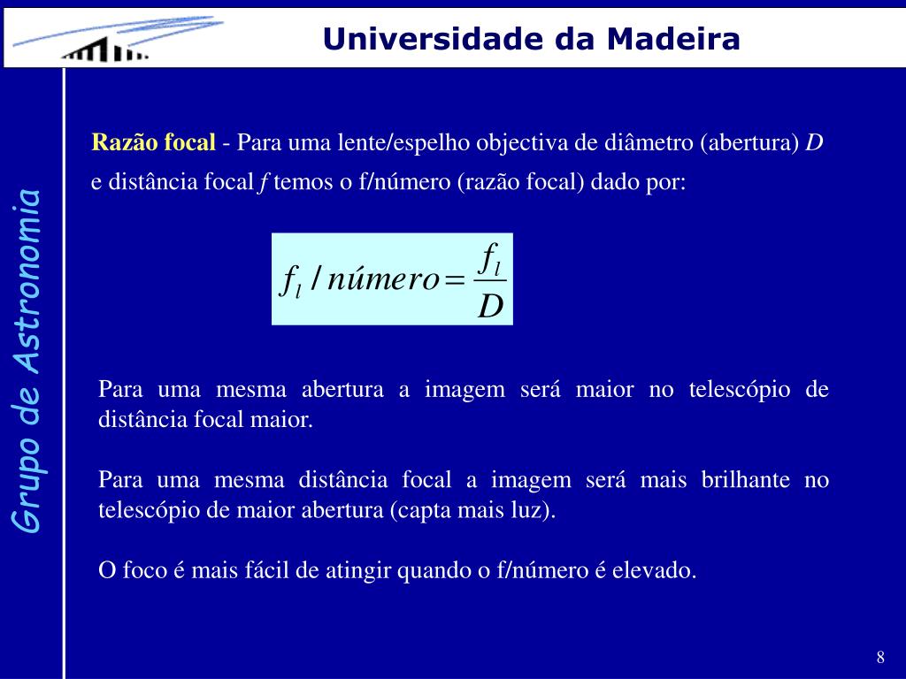 Universidade da Madeira Razão focal - Para uma lente/espelho objectiva de diâmetro (abertura) D e distância focal f temos o f/número (razão focal) dado por: Grupo de Astronomia Para uma mesma abertura a imagem será maior no telescópio de distância focal maior. Para uma mesma distância focal a imagem será mais brilhante no telescópio de maior abertura (capta mais luz). O foco é mais fácil de atingir quando o f/número é elevado. 8