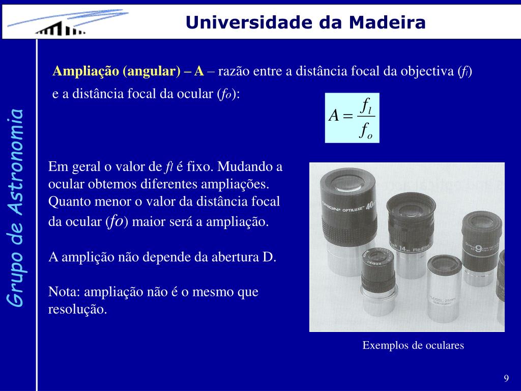 Universidade da Madeira Ampliação (angular) – A – razão entre a distância focal da objectiva (fl) e a distância focal da ocular (fo): Em geral o valor de fl é fixo. Mudando a ocular obtemos diferentes ampliações. Quanto menor o valor da distância focal da ocular (fo) maior será a ampliação. A amplição não depende da abertura D. Nota: ampliação não é o mesmo que resolução. Grupo de Astronomia Exemplos de oculares 9