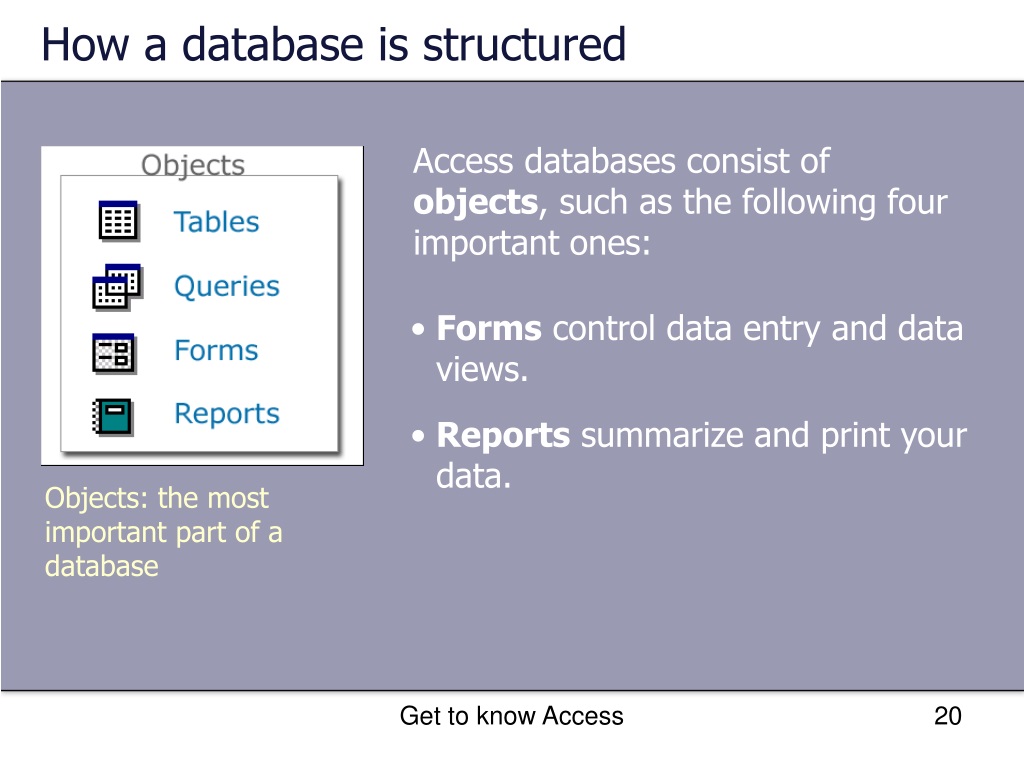 How a database is structured • Access databases consist of objects, such as the following four important ones: • Forms control data entry and data views. • Reports summarize and print your data. Objects: the most important part of a database Get to know Access