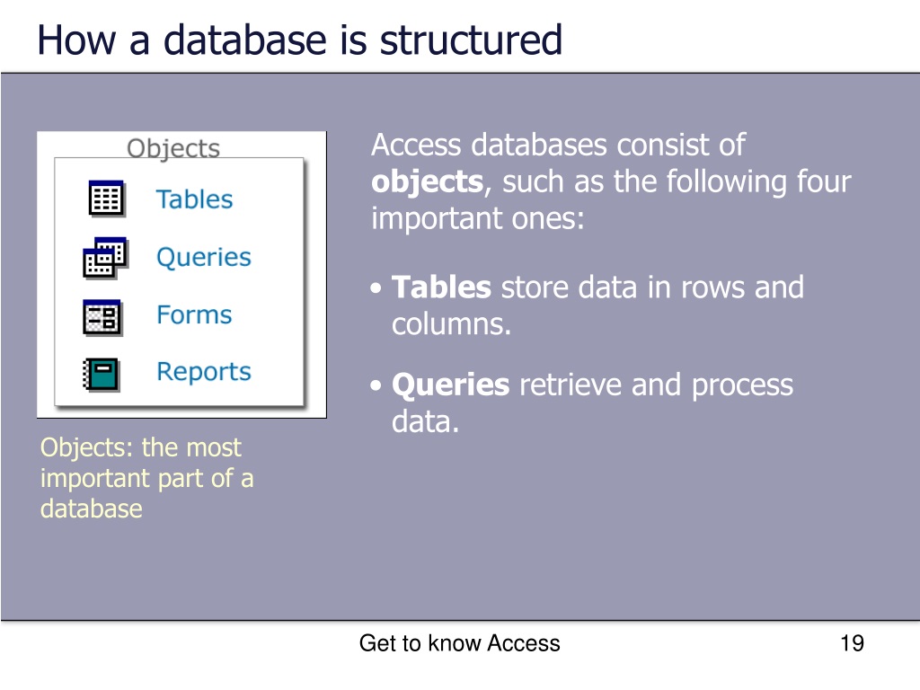 How a database is structured • Access databases consist of objects, such as the following four important ones: • Tables store data in rows and columns. • Queries retrieve and process data. Objects: the most important part of a database Get to know Access