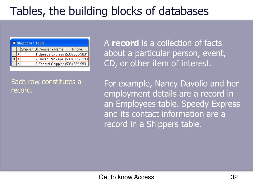 Tables, the building blocks of databases • A record is a collection of facts about a particular person, event, CD, or other item of interest. Each row constitutes a record. For example, Nancy Davolio and her employment details are a record in an Employees table. Speedy Express and its contact information are a record in a Shippers table. Get to know Access