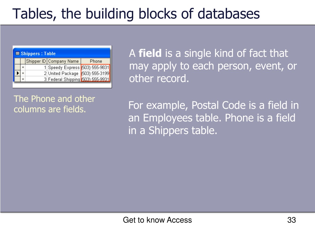 Tables, the building blocks of databases • A field is a single kind of fact that may apply to each person, event, or other record. The Phone and other columns are fields. For example, Postal Code is a field in an Employees table. Phone is a field in a Shippers table. Get to know Access
