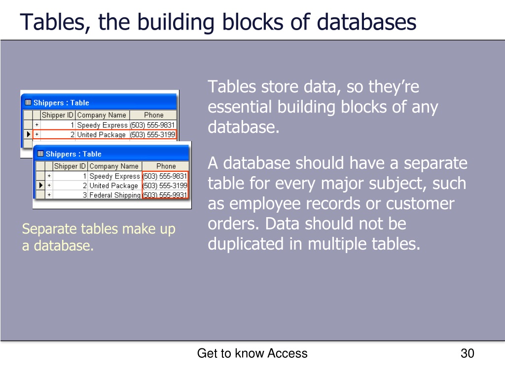 Tables, the building blocks of databases • Tables store data, so they’re essential building blocks of any database. A database should have a separate table for every major subject, such as employee records or customer orders. Data should not be duplicated in multiple tables. Separate tables make up a database. Get to know Access