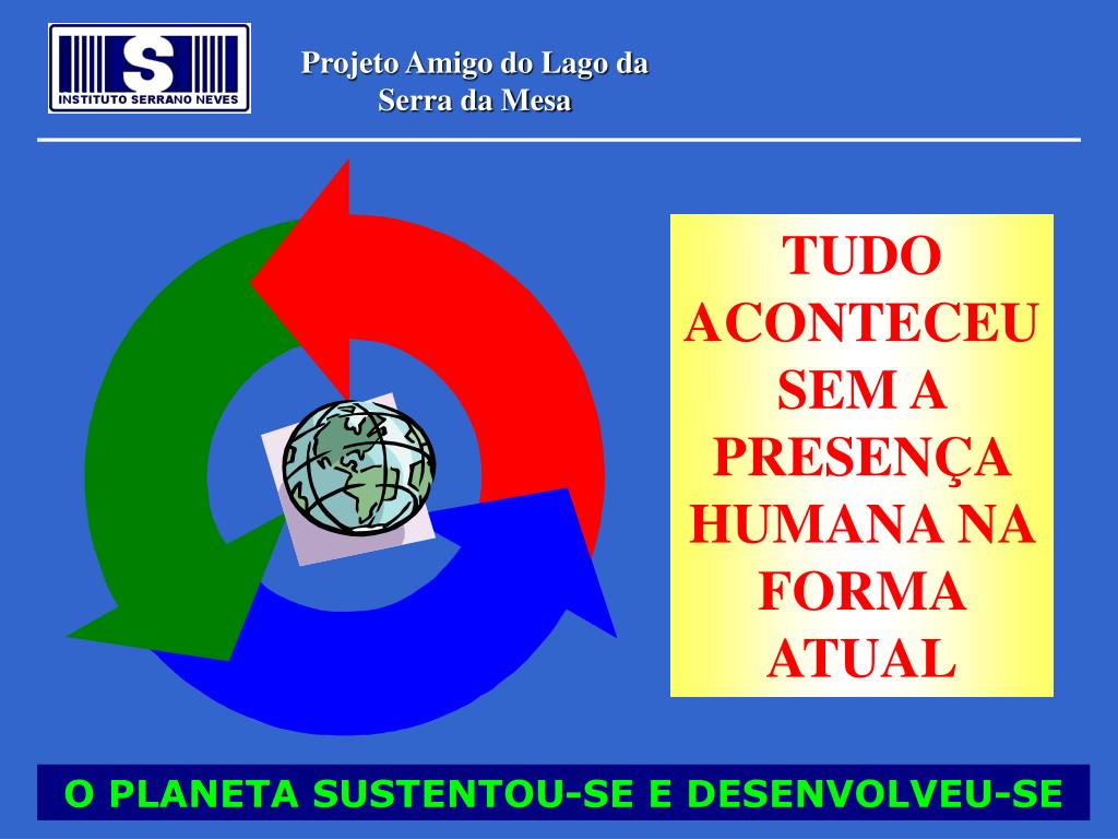 TUDO ACONTECEU SEM A PRESENÇA HUMANA NA FORMA ATUAL. O PLANETA SUSTENTOU-SE E DESENVOLVEU-SE. Projeto Amigo do Lago da Serra da Mesa. Projeto Amigo do Lago da Serra da Mesa. A INTELIGÊNCIA HUMANA ALTEROU OS FLUXOS DE ENERGIA PARA CRIAR NOVAS SITUAÇÕES. O PLANETA DEIXOU DE SER O MESMO.