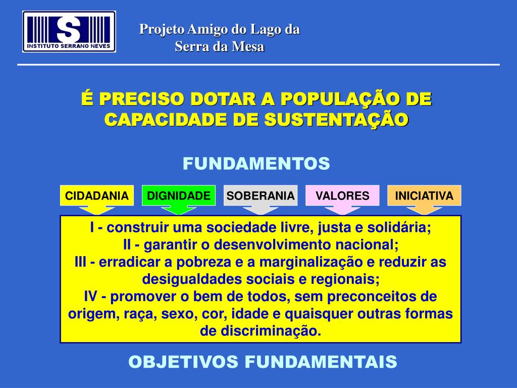 Projeto Amigo do Lago da Serra da Mesa É PRECISO DOTAR A POPULAÇÃO DE CAPACIDADE DE SUSTENTAÇÃO FUNDAMENTOS CIDADANIA DIGNIDADE SOBERANIA VALORES INICIATIVA I - construir uma sociedade livre, justa e solidária;II - garantir o desenvolvimento nacional;III - erradicar a pobreza e a marginalização e reduzir as desigualdades sociais e regionais;IV - promover o bem de todos, sem preconceitos de origem, raça, sexo, cor, idade e quaisquer outras formas de discriminação. OBJETIVOS FUNDAMENTAIS
