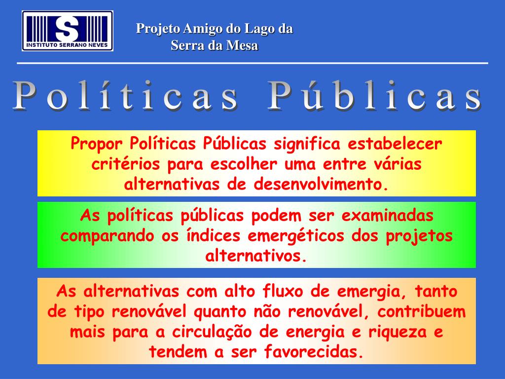 Projeto Amigo do Lago da Serra da Mesa Políticas Públicas Propor Políticas Públicas significa estabelecer critérios para escolher uma entre várias alternativas de desenvolvimento. As políticas públicas podem ser examinadas comparando os índices emergéticos dos projetos alternativos. As alternativas com alto fluxo de emergia, tanto de tipo renovável quanto não renovável, contribuem mais para a circulação de energia e riqueza e tendem a ser favorecidas.
