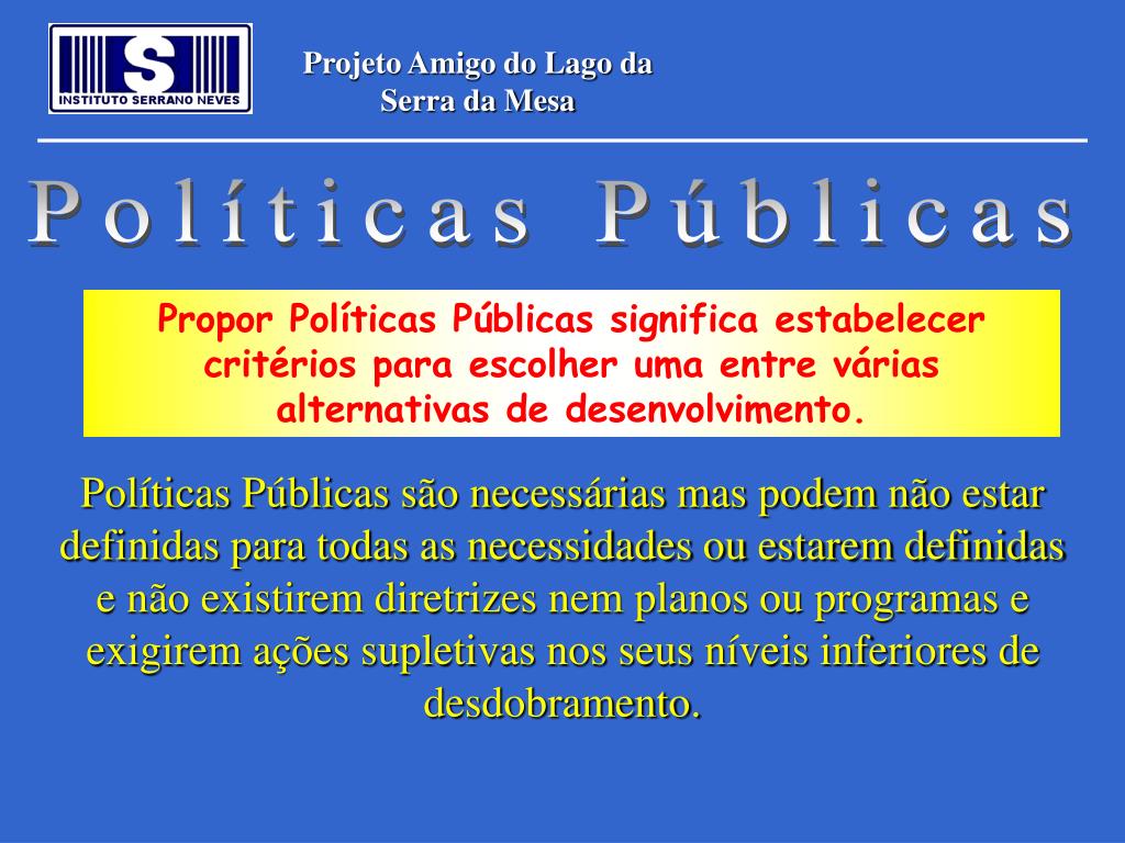 Projeto Amigo do Lago da Serra da Mesa Políticas Públicas Propor Políticas Públicas significa estabelecer critérios para escolher uma entre várias alternativas de desenvolvimento. Políticas Públicas são necessárias mas podem não estar definidas para todas as necessidades ou estarem definidas e não existirem diretrizes nem planos ou programas e exigirem ações supletivas nos seus níveis inferiores de desdobramento.