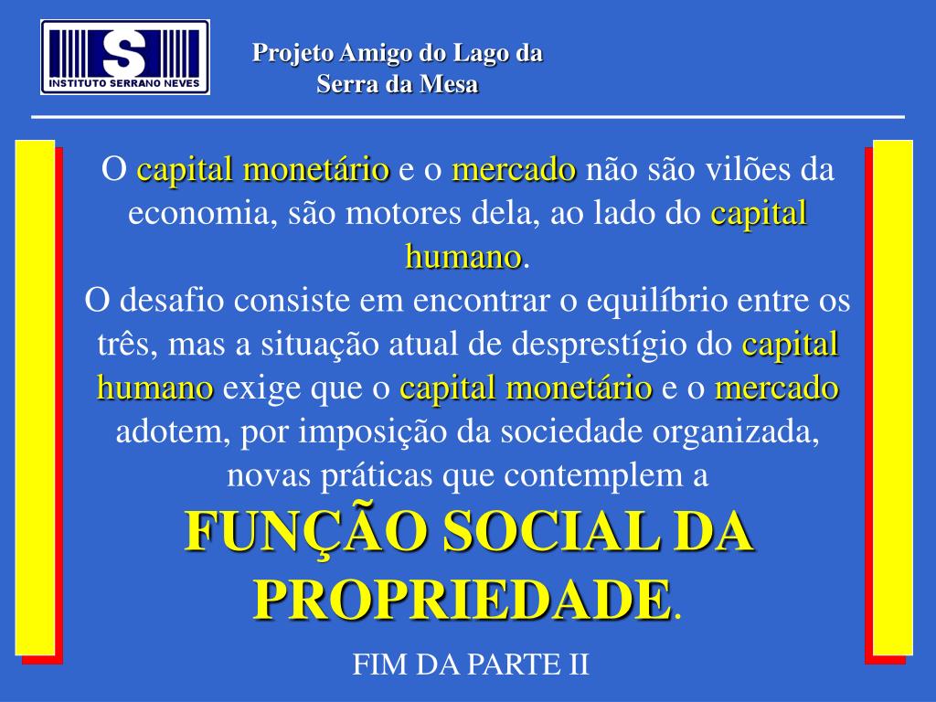 Projeto Amigo do Lago da Serra da Mesa O capital monetário e o mercado não são vilões da economia, são motores dela, ao lado do capital humano.O desafio consiste em encontrar o equilíbrio entre os três, mas a situação atual de desprestígio do capital humano exige que o capital monetário e o mercado adotem, por imposição da sociedade organizada, novas práticas que contemplem a FUNÇÃO SOCIAL DA PROPRIEDADE. FIM DA PARTE II
