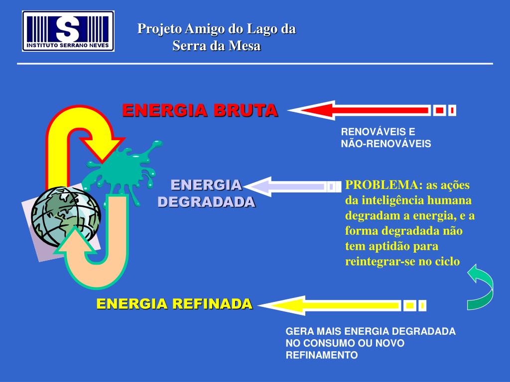 ENERGIA BRUTA RENOVÁVEIS E NÃO-RENOVÁVEIS ENERGIA DEGRADADA ENERGIA REFINADA GERA MAIS ENERGIA DEGRADADA NO CONSUMO OU NOVO REFINAMENTO Projeto Amigo do Lago da Serra da Mesa PROBLEMA: as ações da inteligência humana degradam a energia, e a forma degradada não tem aptidão para reintegrar-se no ciclo