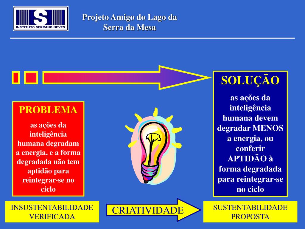 Projeto Amigo do Lago da Serra da Mesa SOLUÇÃO as ações da inteligência humana devem degradar MENOS a energia, ou conferir APTIDÃO à forma degradada para reintegrar-se no ciclo PROBLEMA as ações da inteligência humana degradam a energia, e a forma degradada não tem aptidão para reintegrar-se no ciclo CRIATIVIDADE INSUSTENTABILIDADE VERIFICADA SUSTENTABILIDADE PROPOSTA