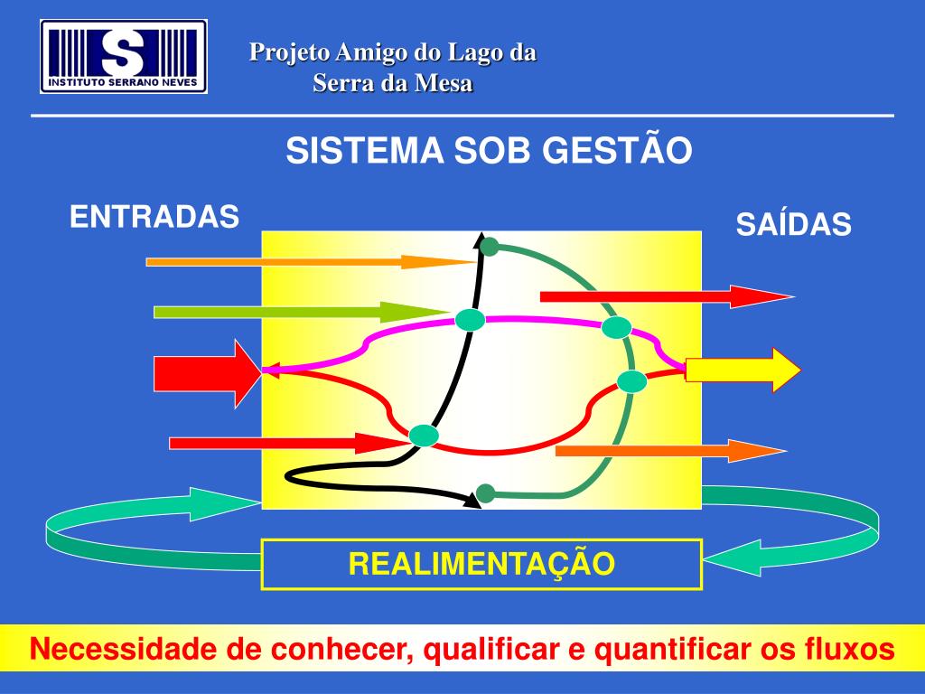 Projeto Amigo do Lago da Serra da Mesa SISTEMA SOB GESTÃO ENTRADAS SAÍDAS REALIMENTAÇÃO Necessidade de conhecer, qualificar e quantificar os fluxos