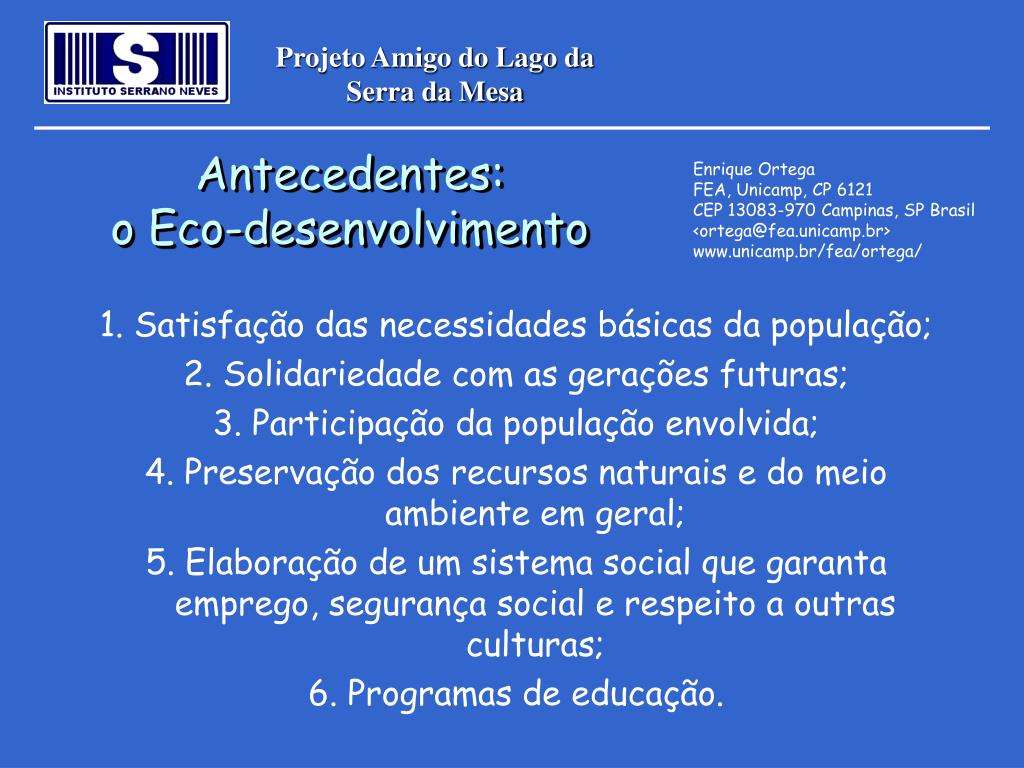 Projeto Amigo do Lago da Serra da Mesa Antecedentes: o Eco-desenvolvimento Enrique OrtegaFEA, Unicamp, CP 6121CEP 13083-970 Campinas, SP Brasil<ortega@fea.unicamp.br>www.unicamp.br/fea/ortega/ 1. Satisfação das necessidades básicas da população; 2. Solidariedade com as gerações futuras; 3. Participação da população envolvida; 4. Preservação dos recursos naturais e do meio ambiente em geral; 5. Elaboração de um sistema social que garanta emprego, segurança social e respeito a outras culturas; 6. Programas de educação.