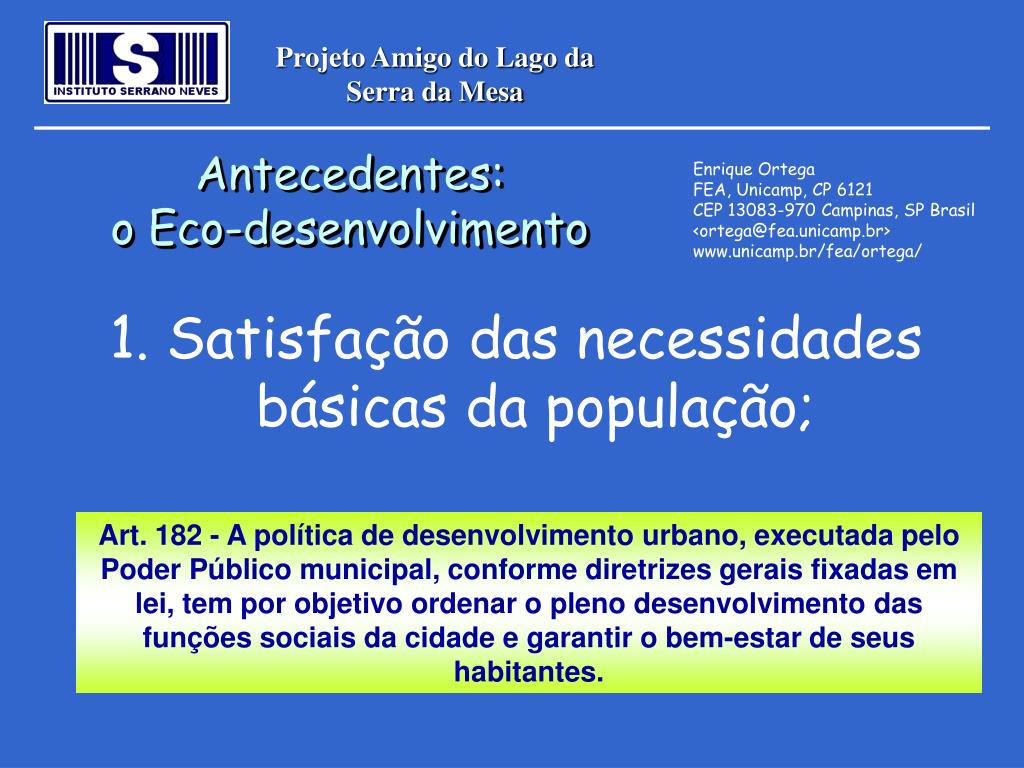 Projeto Amigo do Lago da Serra da Mesa Antecedentes: o Eco-desenvolvimento Enrique OrtegaFEA, Unicamp, CP 6121CEP 13083-970 Campinas, SP Brasil<ortega@fea.unicamp.br>www.unicamp.br/fea/ortega/ 1. Satisfação das necessidades básicas da população; Art. 182 - A política de desenvolvimento urbano, executada pelo Poder Público municipal, conforme diretrizes gerais fixadas em lei, tem por objetivo ordenar o pleno desenvolvimento das funções sociais da cidade e garantir o bem-estar de seus habitantes.
