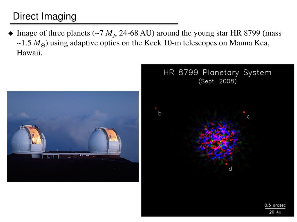 Direct Imaging • Image of three planets (~7 MJ, 24-68 AU) around the young star HR 8799 (mass ~1.5 M) using adaptive optics on the Keck 10-m telescopes on Mauna Kea, Hawaii.