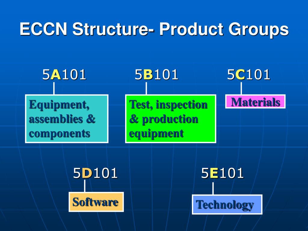 5A101 5B101 5C101 5D101 5E101 ECCN Structure- Product Groups Equipment, assemblies & components Test, inspection & production equipment Materials Software Technology