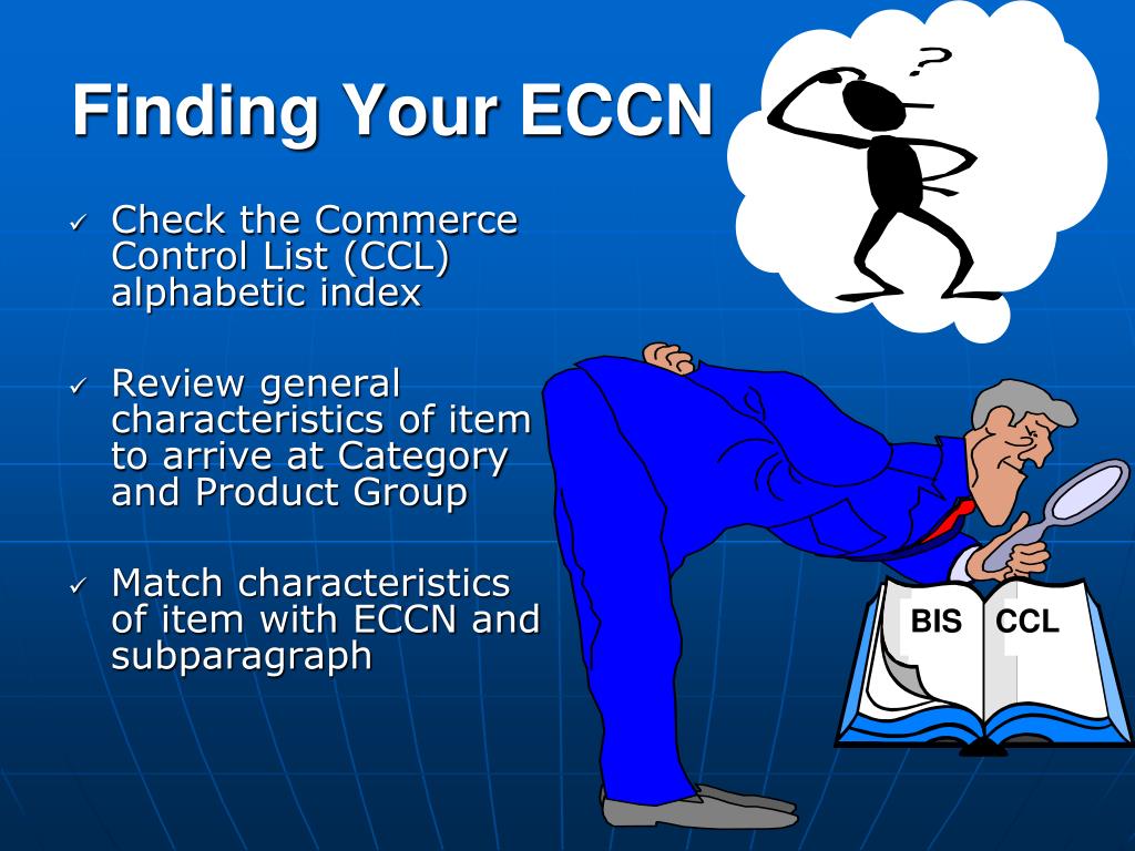 Finding Your ECCN • Check the Commerce Control List (CCL) alphabetic index • Review general characteristics of item to arrive at Category and Product Group • Match characteristics of item with ECCN and subparagraph BIS CCL
