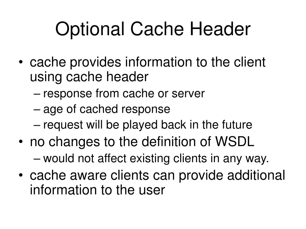 Optional Cache Header • cache provides information to the client using cache header • response from cache or server • age of cached response • request will be played back in the future • no changes to the definition of WSDL • would not affect existing clients in any way. • cache aware clients can provide additional information to the user