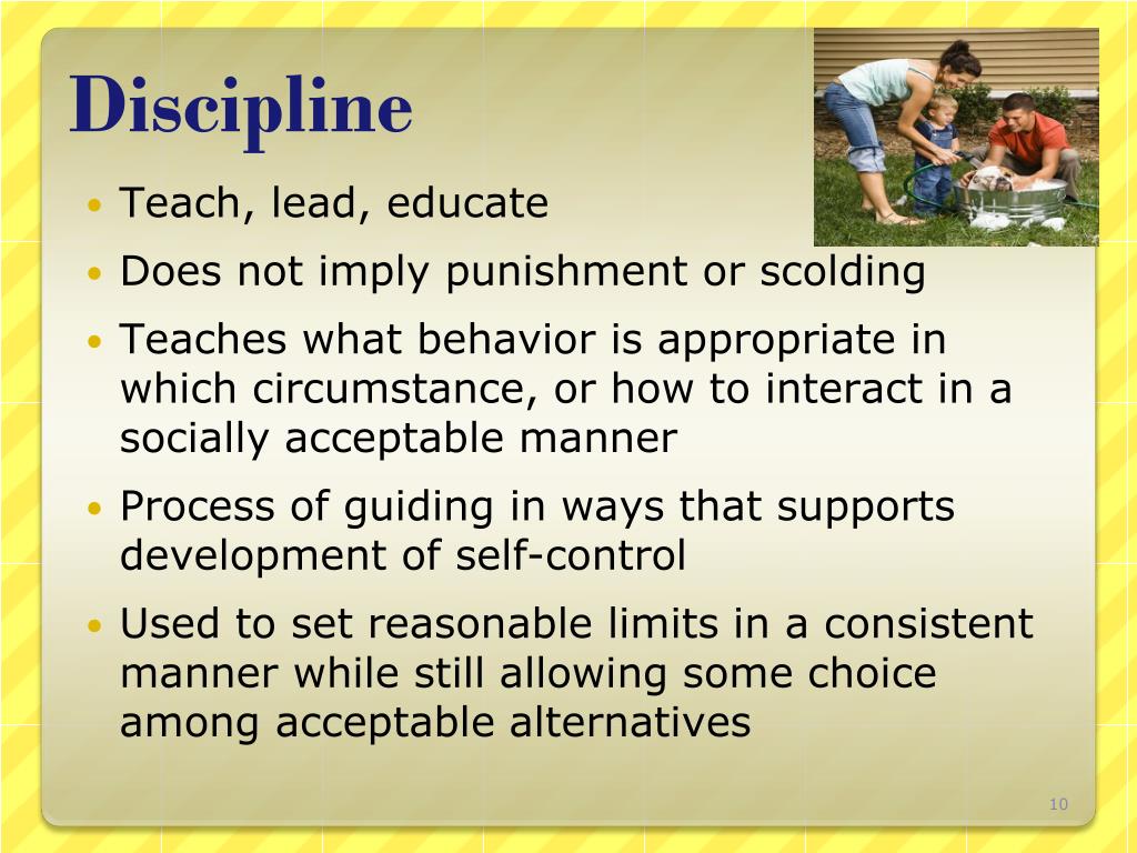 Discipline • Teach, lead, educate • Does not imply punishment or scolding • Teaches what behavior is appropriate in which circumstance, or how to interact in a socially acceptable manner • Process of guiding in ways that supports development of self-control • Used to set reasonable limits in a consistent manner while still allowing some choice among acceptable alternatives