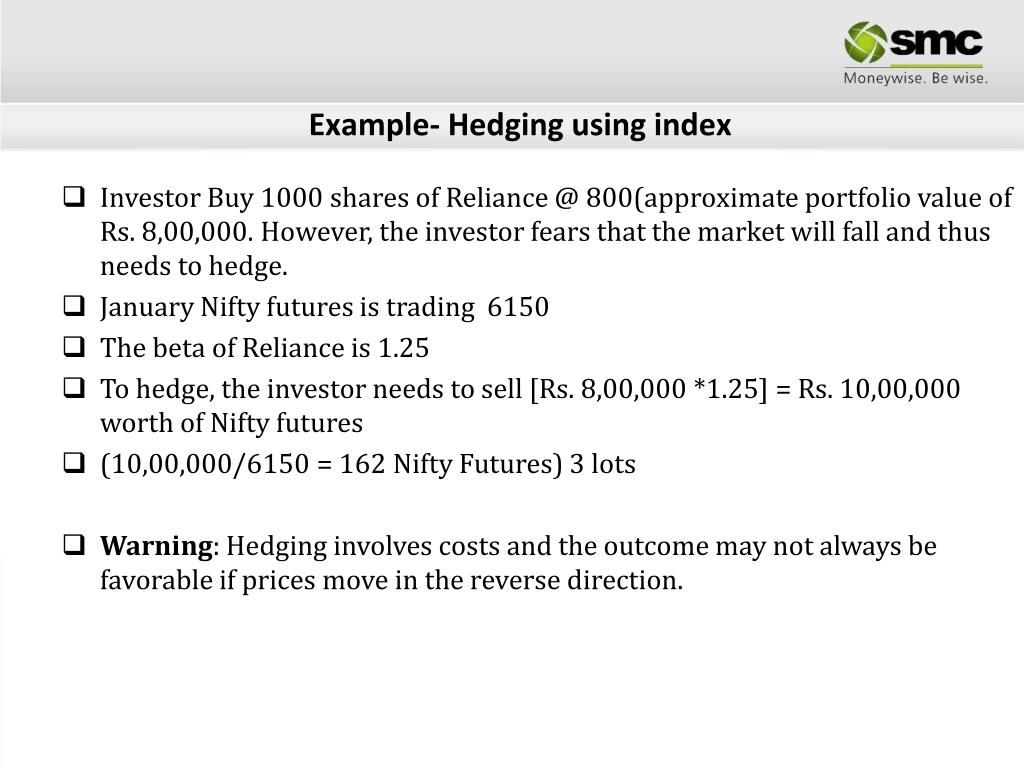 Investor Buy 1000 shares of Reliance @ 800(approximate portfolio value of Rs. 8,00,000. However, the investor fears that the market will fall and thus needs to hedge. • January Nifty futures is trading 6150 • The beta of Reliance is 1.25 • To hedge, the investor needs to sell [Rs. 8,00,000 *1.25] = Rs. 10,00,000 worth of Nifty futures • (10,00,000/6150 = 162 Nifty Futures) 3 lots • Warning: Hedging involves costs and the outcome may not always be favorable if prices move in the reverse direction. Example- Hedging using index