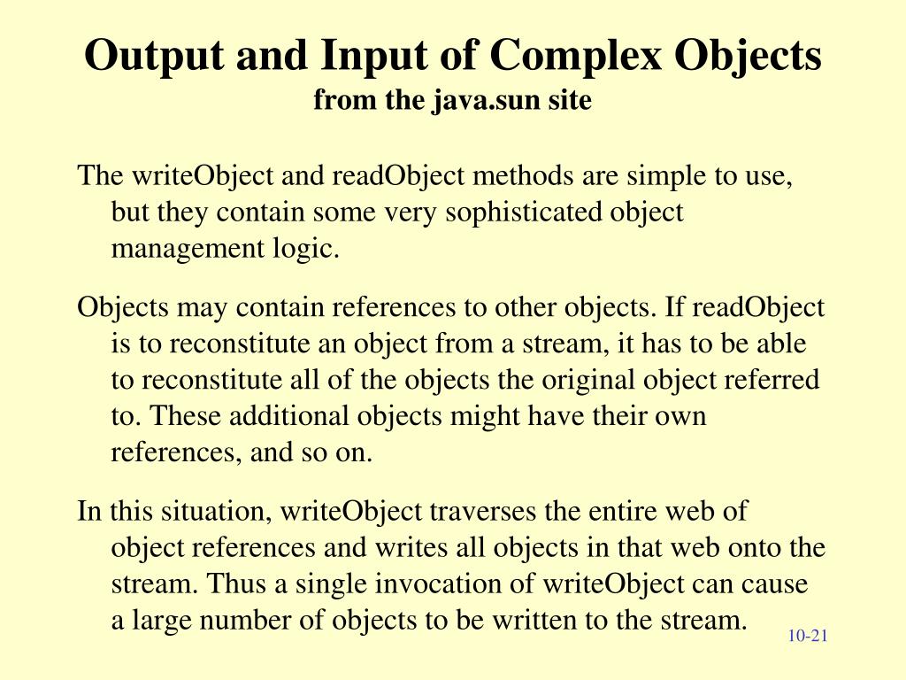 Output and Input of Complex Objects from the java.sun site The writeObject and readObject methods are simple to use, but they contain some very sophisticated object management logic. Objects may contain references to other objects. If readObject is to reconstitute an object from a stream, it has to be able to reconstitute all of the objects the original object referred to. These additional objects might have their own references, and so on. In this situation, writeObject traverses the entire web of object references and writes all objects in that web onto the stream. Thus a single invocation of writeObject can cause a large number of objects to be written to the stream.