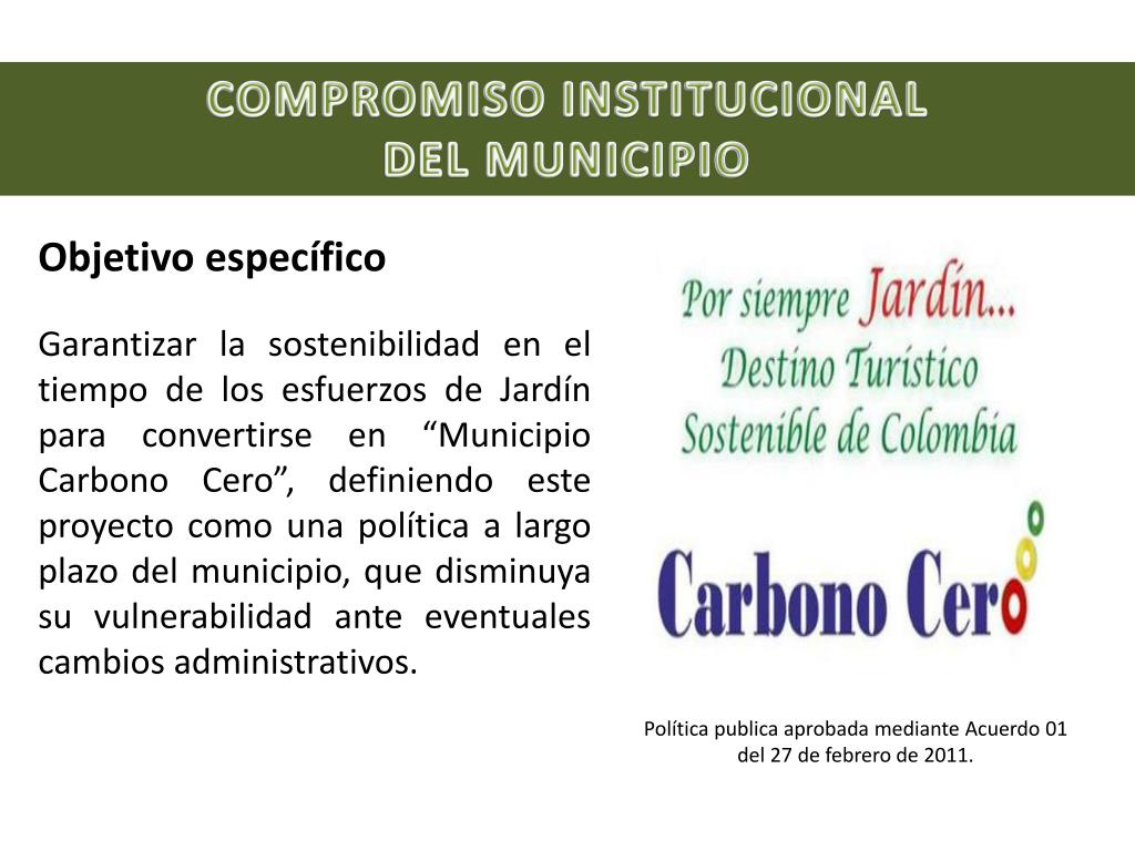 COMPROMISO INSTITUCIONAL DEL MUNICIPIO Objetivo específico • Garantizar la sostenibilidad en el tiempo de los esfuerzos de Jardín para convertirse en “Municipio Carbono Cero”, definiendo este proyecto como una política a largo plazo del municipio, que disminuya su vulnerabilidad ante eventuales cambios administrativos. Política publica aprobada mediante Acuerdo 01 del 27 de febrero de 2011.