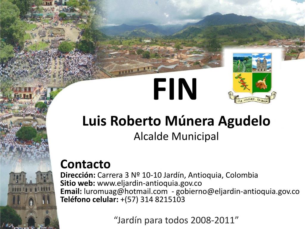 FIN Luis Roberto Múnera Agudelo Alcalde Municipal Contacto Dirección: Carrera 3 Nº 10-10 Jardín, Antioquia, Colombia Sitio web: www.eljardin-antioquia.gov.co Email:luromuag@hotmail.com - gobierno@eljardin-antioquia.gov.co Teléfono celular: +(57) 314 8215103 “Jardín para todos 2008-2011”