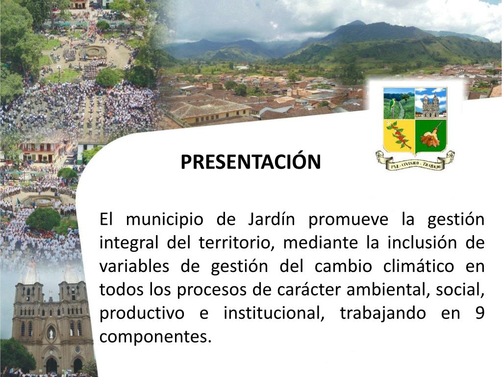 MUNICIPIO DE JARDÍN. PRESENTACIÓN . El municipio de Jardín promueve la gestión integral del territorio, mediante la inclusión de variables de gestión del cambio climático en todos los procesos de carácter ambiental, social, productivo e institucional, trabajando en 9 componentes .