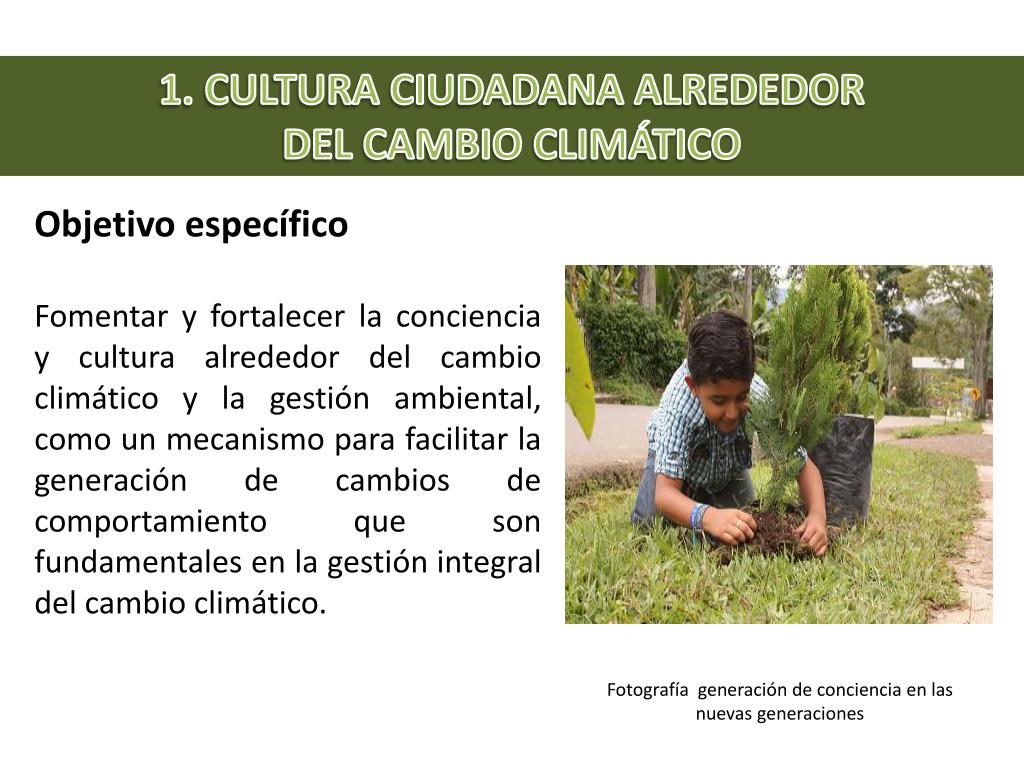 1. CULTURA CIUDADANA ALREDEDOR DEL CAMBIO CLIMÁTICO Objetivo específico Fomentar y fortalecer la conciencia y cultura alrededor del cambio climático y la gestión ambiental, como un mecanismo para facilitar la generación de cambios de comportamiento que son fundamentales en la gestión integral del cambio climático. Fotografía generación de conciencia en las nuevas generaciones
