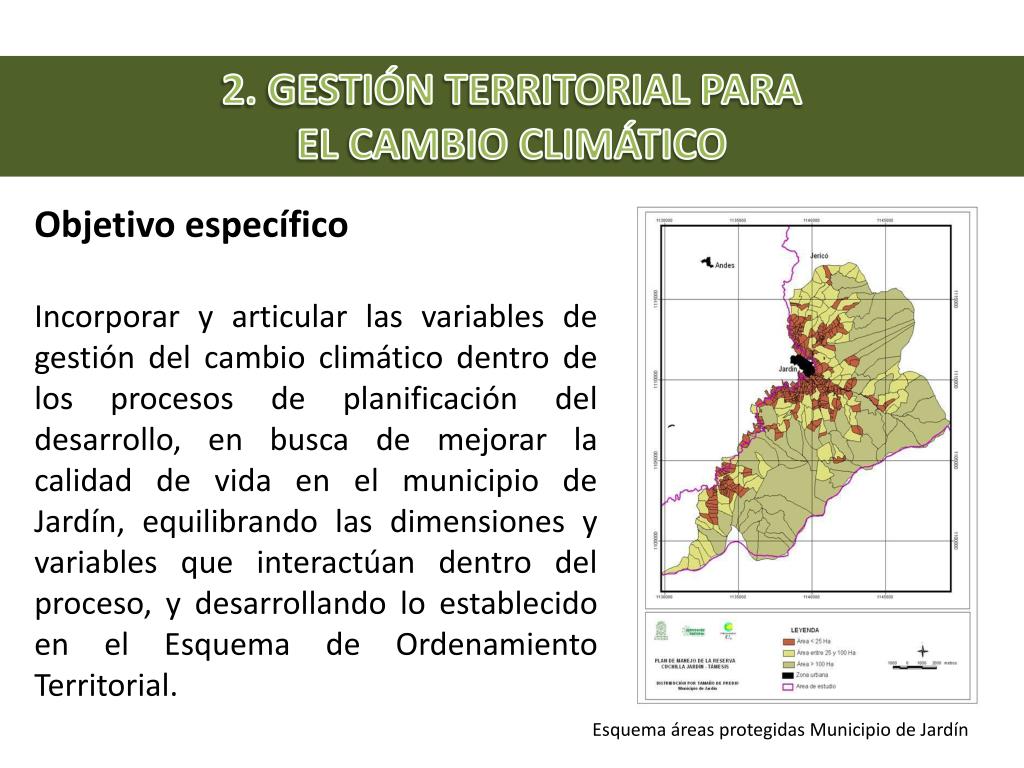 2. GESTIÓN TERRITORIAL PARA EL CAMBIO CLIMÁTICO Objetivo específico • Incorporar y articular las variables de gestión del cambio climático dentro de los procesos de planificación del desarrollo, en busca de mejorar la calidad de vida en el municipio de Jardín, equilibrando las dimensiones y variables que interactúan dentro del proceso, y desarrollando lo establecido en el Esquema de Ordenamiento Territorial. Esquema áreas protegidas Municipio de Jardín