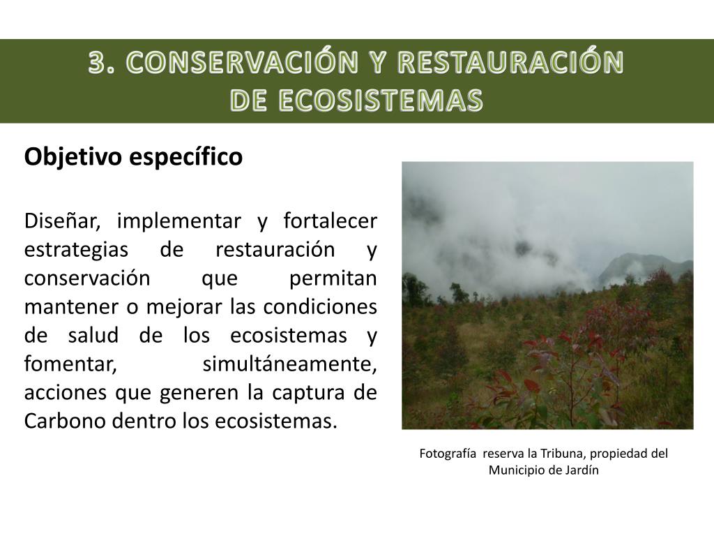 3. CONSERVACIÓN Y RESTAURACIÓN DE ECOSISTEMAS Objetivo específico • Diseñar, implementar y fortalecer estrategias de restauración y conservación que permitan mantener o mejorar las condiciones de salud de los ecosistemas y fomentar, simultáneamente, acciones que generen la captura de Carbono dentro los ecosistemas. Fotografía reserva la Tribuna, propiedad del Municipio de Jardín