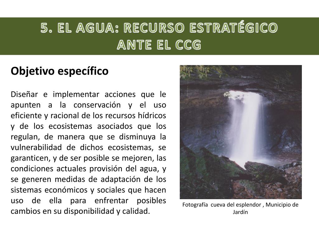 5. EL AGUA: RECURSO ESTRATÉGICO ANTE EL CCG Objetivo específico • Diseñar e implementar acciones que le apunten a la conservación y el uso eficiente y racional de los recursos hídricos y de los ecosistemas asociados que los regulan, de manera que se disminuya la vulnerabilidad de dichos ecosistemas, se garanticen, y de ser posible se mejoren, las condiciones actuales provisión del agua, y se generen medidas de adaptación de los sistemas económicos y sociales que hacen uso de ella para enfrentar posibles cambios en su disponibilidad y calidad. Fotografía cueva del esplendor , Municipio de Jardín