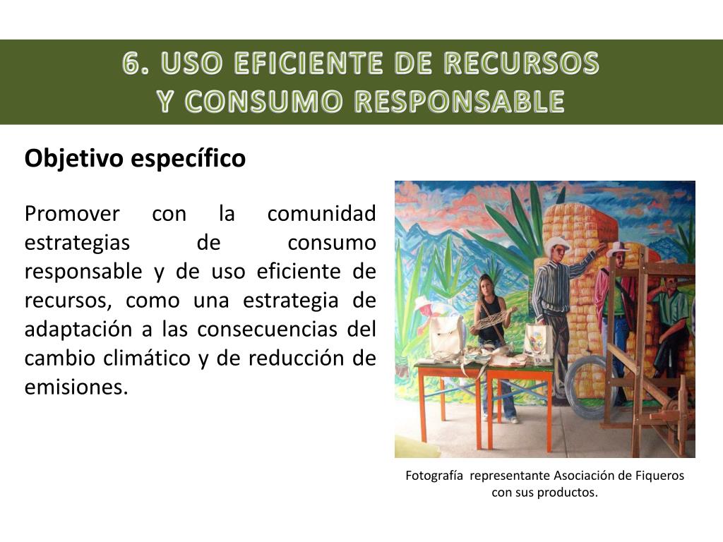 6. USO EFICIENTE DE RECURSOS Y CONSUMO RESPONSABLE Objetivo específico • Promover con la comunidad estrategias de consumo responsable y de uso eficiente de recursos, como una estrategia de adaptación a las consecuencias del cambio climático y de reducción de emisiones. Fotografía representante Asociación de Fiqueros con sus productos.