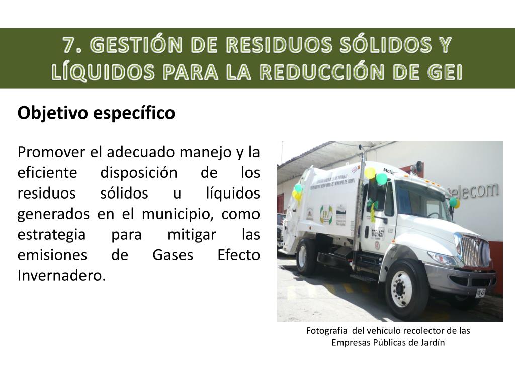 7. GESTIÓN DE RESIDUOS SÓLIDOS Y LÍQUIDOS PARA LA REDUCCIÓN DE GEI Objetivo específico • Promover el adecuado manejo y la eficiente disposición de los residuos sólidos u líquidos generados en el municipio, como estrategia para mitigar las emisiones de Gases Efecto Invernadero. Fotografía del vehículo recolector de las Empresas Públicas de Jardín