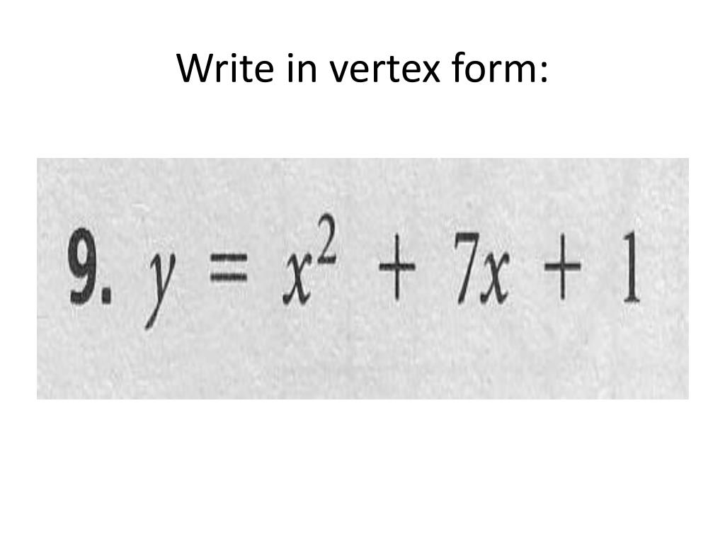 Ex1. Write the function y = 2x2 + 10x + 7 in vertex form. x-coordinate: -b/2a -10/2(2) = -10/4 =-5/2 or - 2.5 y-coordinate: 2(-2.5)2 + 10(-2.5) + 7 -5.5 Substitute the vertex point (-2.5,-5.5) into the vertex form y = a(x – h)2 + k a from above y = 2(x + 2.5)2 – 5.5
