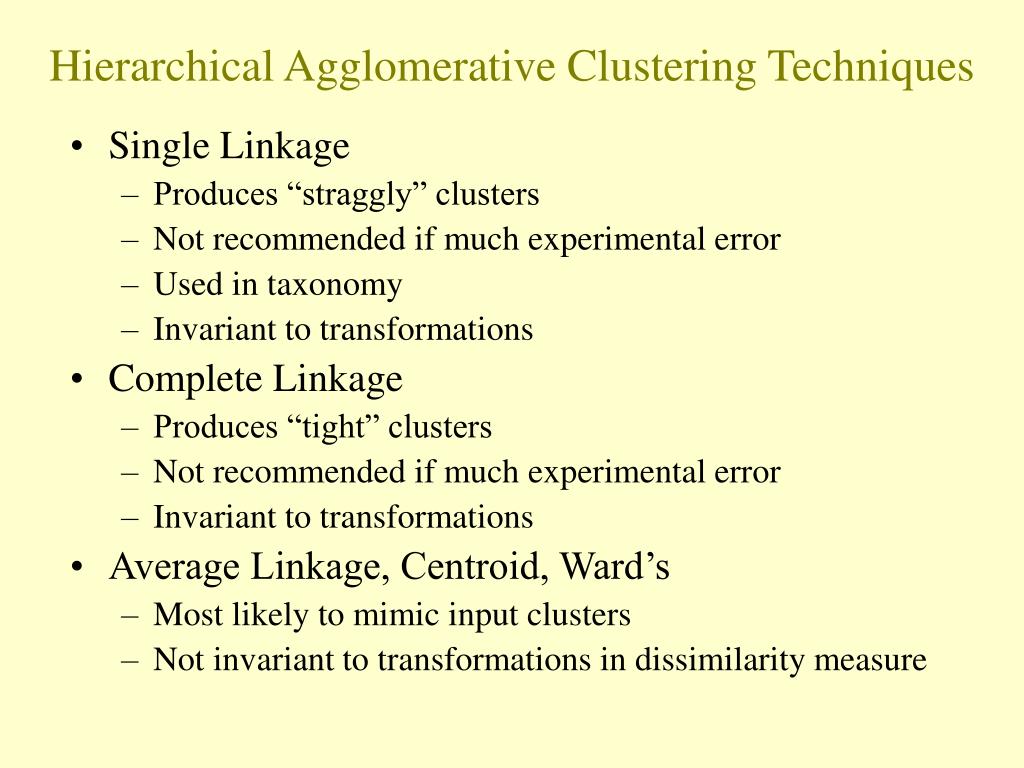 Hierarchical Agglomerative Clustering Techniques • Single Linkage • Produces “straggly” clusters • Not recommended if much experimental error • Used in taxonomy • Invariant to transformations • Complete Linkage • Produces “tight” clusters • Not recommended if much experimental error • Invariant to transformations • Average Linkage, Centroid, Ward’s • Most likely to mimic input clusters • Not invariant to transformations in dissimilarity measure