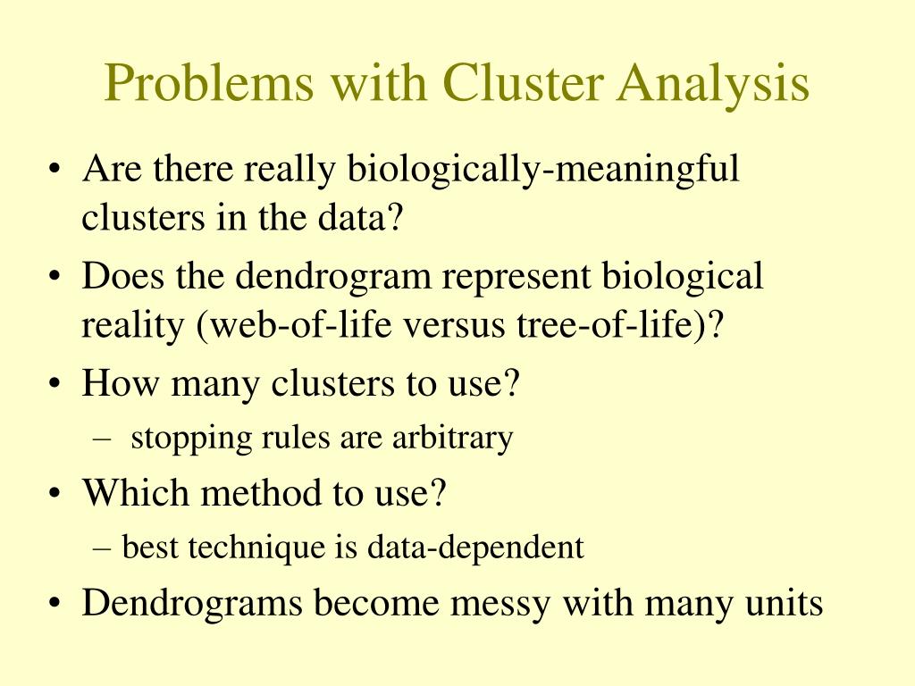 Problems with Cluster Analysis • Are there really biologically-meaningful clusters in the data? • Does the dendrogram represent biological reality (web-of-life versus tree-of-life)? • How many clusters to use? • stopping rules are arbitrary • Which method to use? • best technique is data-dependent • Dendrograms become messy with many units