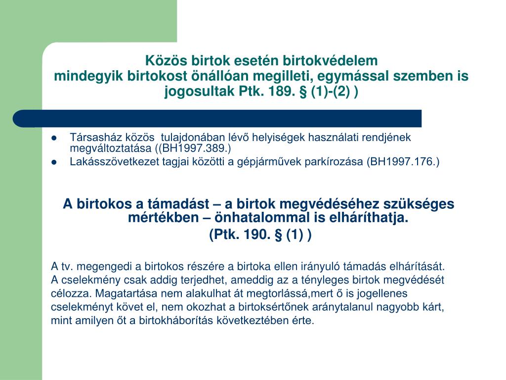 Közös birtok esetén birtokvédelem mindegyik birtokost önállóan megilleti, egymással szemben is jogosultak Ptk. 189. § (1)-(2) ) • Társasház közös tulajdonában lévő helyiségek használati rendjének megváltoztatása ((BH1997.389.) • Lakásszövetkezet tagjai közötti a gépjárművek parkírozása (BH1997.176.) A birtokos a támadást – a birtok megvédéséhez szükséges mértékben – önhatalommal is elháríthatja. (Ptk. 190. § (1) ) A tv. megengedi a birtokos részére a birtoka ellen irányuló támadás elhárítását. A cselekmény csak addig terjedhet, ameddig az a tényleges birtok megvédését célozza. Magatartása nem alakulhat át megtorlássá,mert ő is jogellenes cselekményt követ el, nem okozhat a birtoksértőnek aránytalanul nagyobb kárt, mint amilyen őt a birtokháborítás következtében érte.