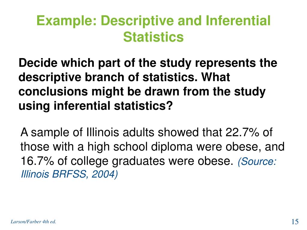 Example: Descriptive and Inferential Statistics Decide which part of the study represents the descriptive branch of statistics. What conclusions might be drawn from the study using inferential statistics? A sample of Illinois adults showed that 22.7% of those with a high school diploma were obese, and 16.7% of college graduates were obese. (Source: Illinois BRFSS, 2004) Larson/Farber 4th ed.