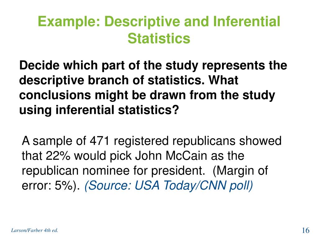 Example: Descriptive and Inferential Statistics A sample of 471 registered republicans showed that 22% would pick John McCain as the republican nominee for president. (Margin of error: 5%). (Source: USA Today/CNN poll) Decide which part of the study represents the descriptive branch of statistics. What conclusions might be drawn from the study using inferential statistics? Larson/Farber 4th ed. 16