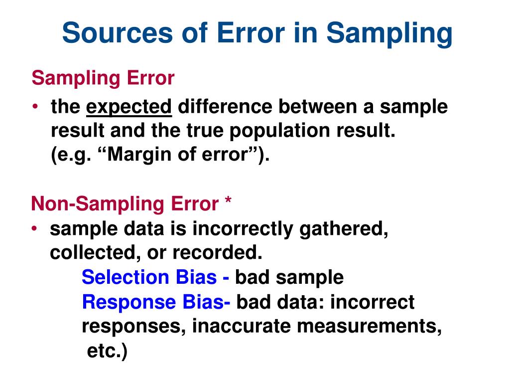 Sources of Error in Sampling Non-Sampling Error * • sample data is incorrectly gathered, collected, or recorded. Selection Bias - bad sample Response Bias- bad data: incorrect responses, inaccurate measurements, etc.) Sampling Error the expected difference between a sample result and the true population result. (e.g. “Margin of error”).