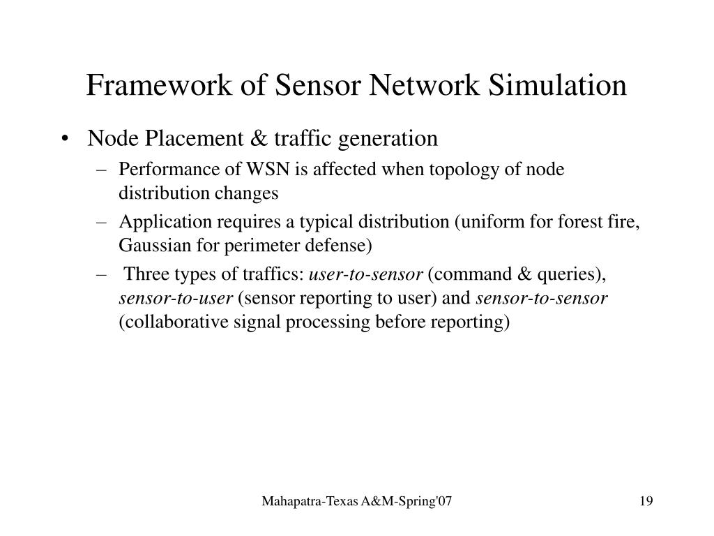 Framework of Sensor Network Simulation • Node Placement & traffic generation • Performance of WSN is affected when topology of node distribution changes • Application requires a typical distribution (uniform for forest fire, Gaussian for perimeter defense) • Three types of traffics: user-to-sensor (command & queries), sensor-to-user (sensor reporting to user) and sensor-to-sensor (collaborative signal processing before reporting) Mahapatra-Texas A&M-Spring'07