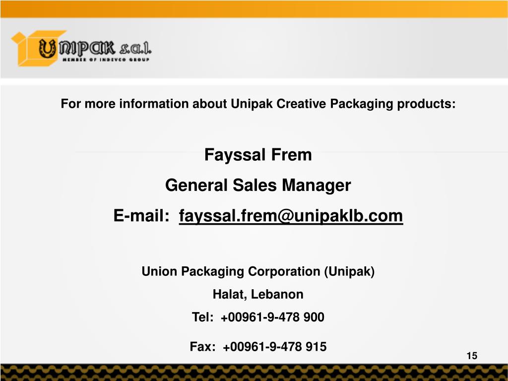 For more information about Unipak Creative Packaging products: Fayssal Frem General Sales Manager E-mail: fayssal.frem@unipaklb.com Union Packaging Corporation (Unipak) Halat, Lebanon Tel: +00961-9-478 900 Fax: +00961-9-478 915