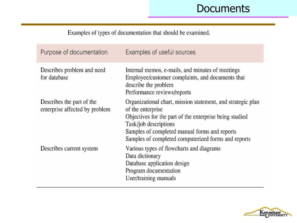 Fact-Finding Techniques • Database developer normally uses several fact-finding techniques during a single database project including: • examining documentation, • interviewing, • Group interview, JAD • observing organization in operation, • research, • questionnaires. Which method above is the most commonly used ?