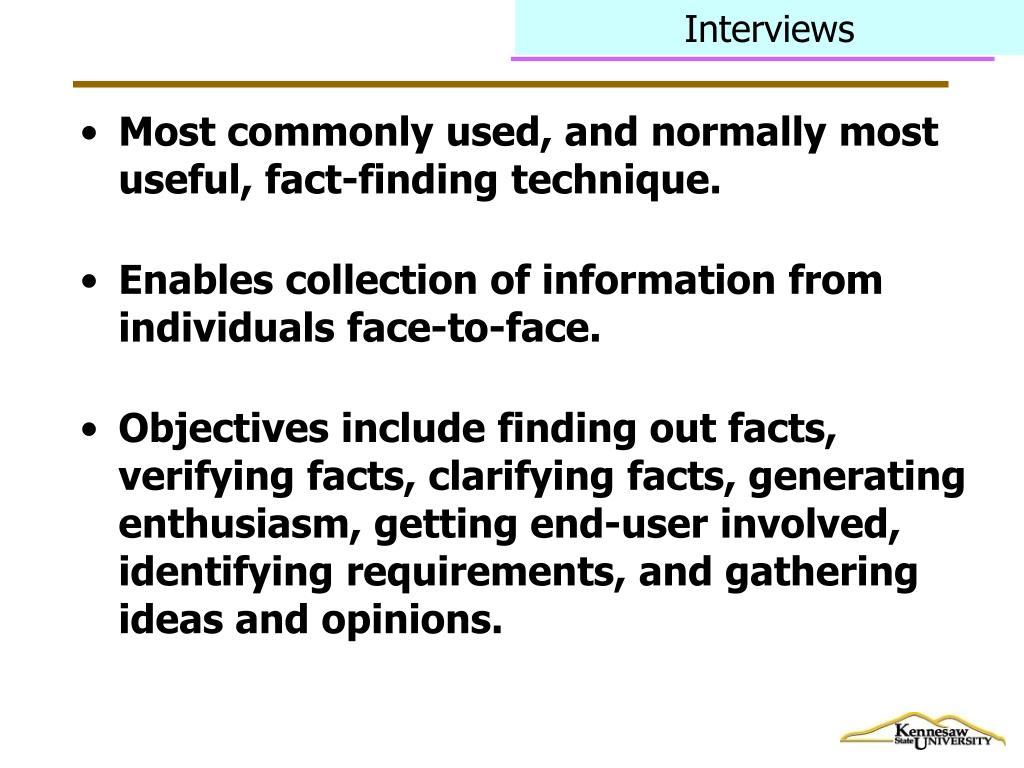 Fact Finding Techniques. IS8080 Dr. Mario Guimaraes. Fact Finding. Formal process of using techniques such as interviews and questionnaires to collect facts about systems, requirements, and preferences .